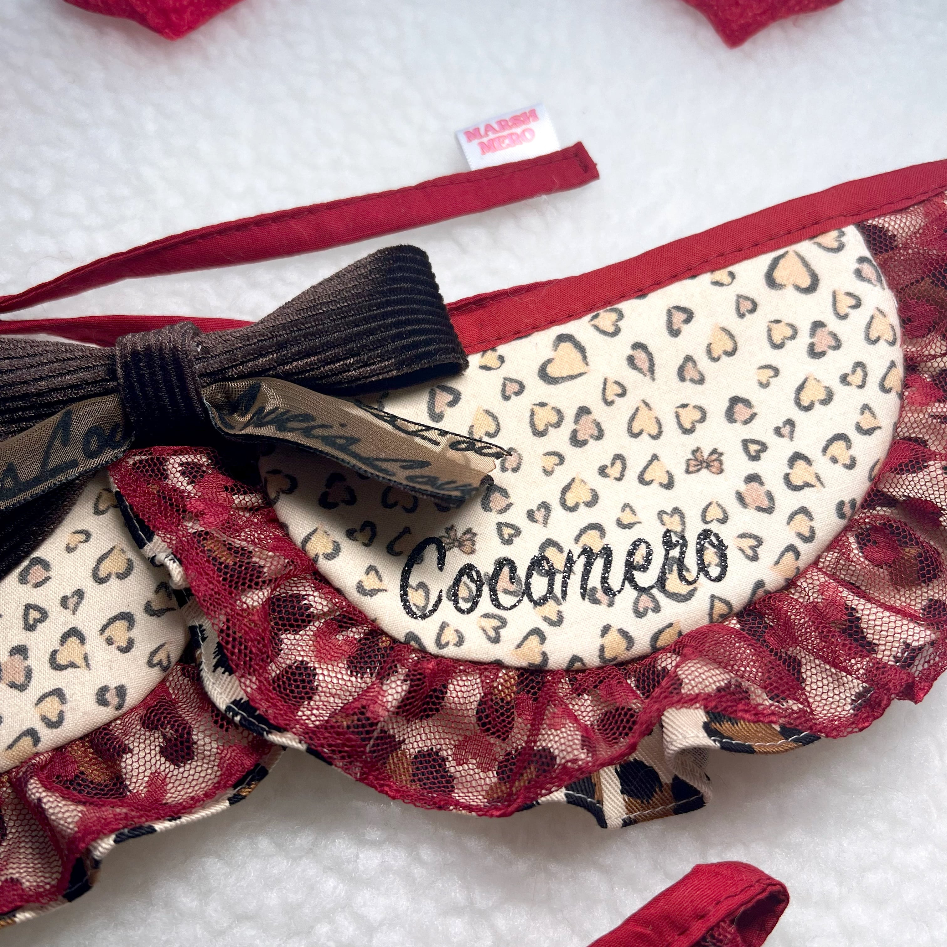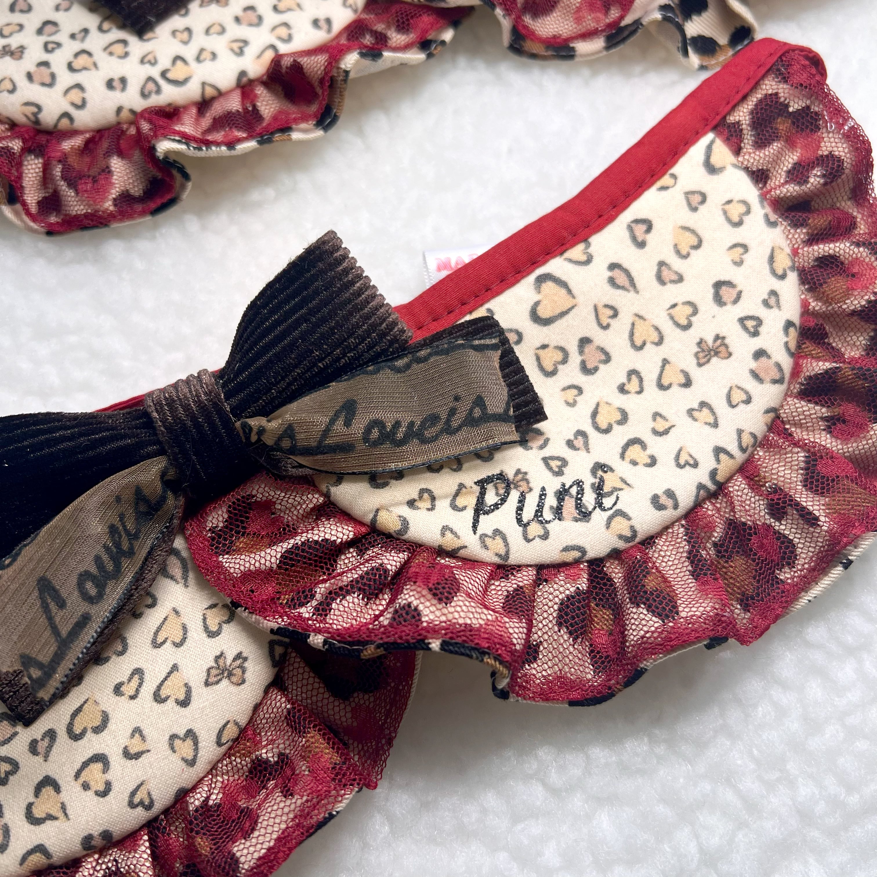 グリッターでキラキラなネームがポイントの派手めレオパード柄付け襟です。フリル部分はハートのレース生地と2層になっていって、より華やかな印象に!